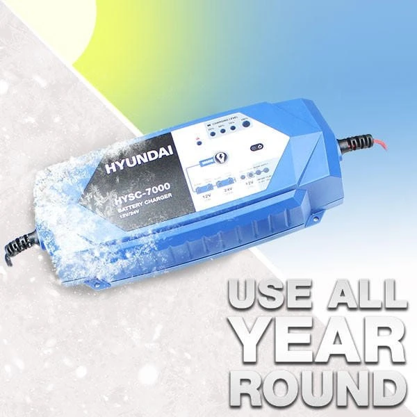 Smart Battery Charger for 24v and 12v Batteries The HYSC-7000 is a SMART 230V car battery charger from Hyundai suitable for car batteries, motorbike, motorhomes, caravan leisure batteries and more Charge A Variety Of Batteries Designed for charging all types of 12V lead acid, 24V lead acid batteries AND 12v lithium-ion batteries, including WET (Flooded), MF (Maintenance-Free), EFB (Enhanced Flooded Battery), AGM (Absorbed Glass Mat), AGM+ and LIB (Lithium-Ion) batteries. It is suitable for charging battery capacities from 1.2 to 130 amp-hours and maintaining all battery sizes. Battery Repair Mode Extend the life of tired batteries with Repair Mode, an advanced battery recovery mode for repairing old, idle, stratified or sulfated batteries Fast, Easy, Safe Battery Charger The HYSC-7000 features a built-in intelligent microprocessor making charging faster, easier and safer. Charger Safety Features Spark proof with protection for reverse polarity, short circuit, overheat and overcharge. It also has auto-memory, which returns the last selected charger mode when restarted (except battery repair modes). When the battery level indicator bars are flashing, it is charging, when 5 bars are solid the charging is completed. But do not break the connection immediately. When your battery is fully charged the charger automatically switches from full charge to maintenance status to prevent overcharging or damage to the battery. In The Box: HYSC-7000 battery charger User manual Cable clamps Warranty Covered by Hyundai 1 year warranty. Key Features Battery charger for 24v and 12v batteries, includimg lithium-ion batteries Ideal smart battery charger for cars, vans, motorhomes and boats in storage Charger for all types of batteries – 12V lead-acid, 24V lead-acid and 12V lithium-ion batteries, including WET (Flooded), GEL, MF (Maintenance-Free), EFB (Enhanced Flooded Battery), AGM (Absorbed Glass Mat), AGM+ and LIB (Lithium Ion) batteries. Built-in intelligent microprocessor makes this charging and maintaining faster, easier and safer. 24v / 12v Battery Repair Mode – advanced battery recovery mode for repairing old, idle, stratified or sulfated batteries Safety features including spark proof, protection for reverse polarity, short circuit, overcurrent overcharge and overheat. Auto-memory function. Automatically switches from full charge to maintenance status without overcharging or damaging the battery. 1 year Hyundai warranty